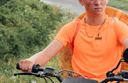 Photo Vingt Dieux - garçon sur un scooter avec une meule de comté sur le dos